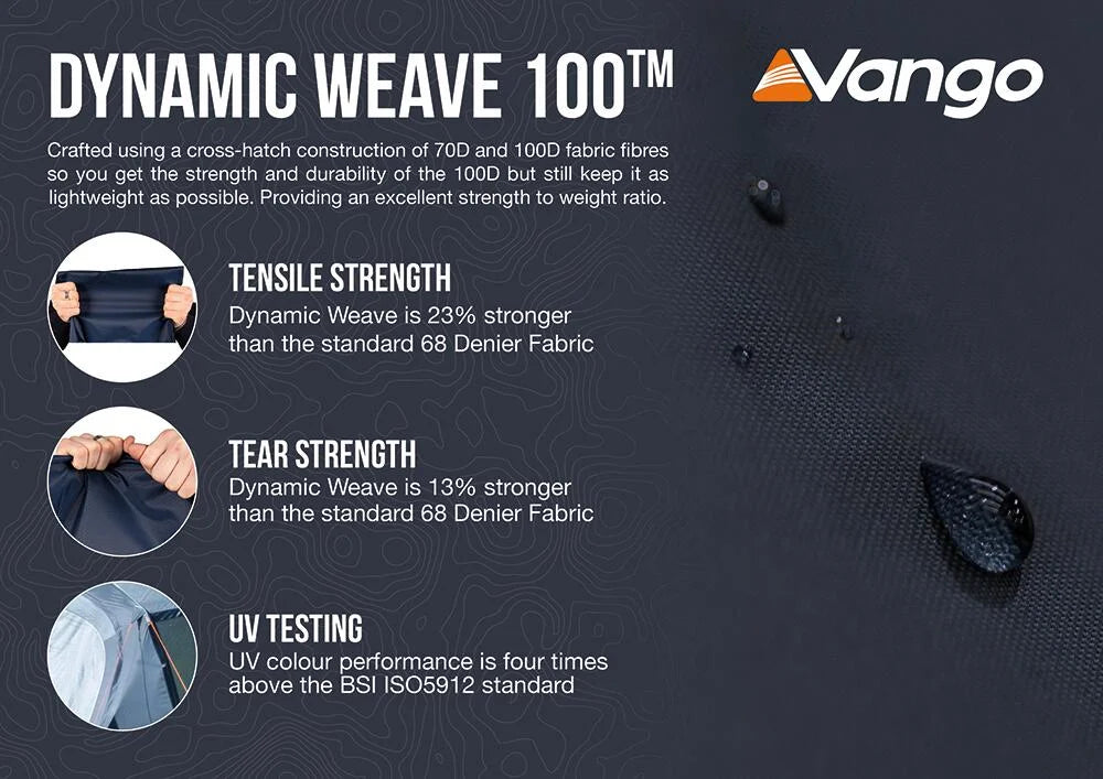 - Dynamic Weave 100 - Our Dynamic Weave fabric construction creates a strong and durable fabric, designed to last. The fabric is crafted in a cross-hatch construction to make the fabric stronger, and stand up to the rigours of camping.